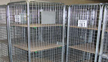 Eine weitere Möglichkeit, Akten sicher zu transportieren, bieten die Gitterrollwagen. Sie sind abschließbar und bieten Platz für ca. 5 laufende Meter Akten und Dokumente.