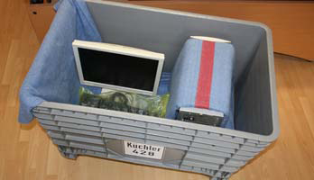 Das ideale Transportmittel, für PC-Equipment in dem komplette Einheiten (Bildschirm, Rechner, Drucker, Scanner) problemlos und sicher an Ihren neuen Standort transportiert werden. Für das Zubehör wie Tastatur, Maus und Kabel stellen wir Ihnen EDV-Zubehör-Tüten zur Verfügung.